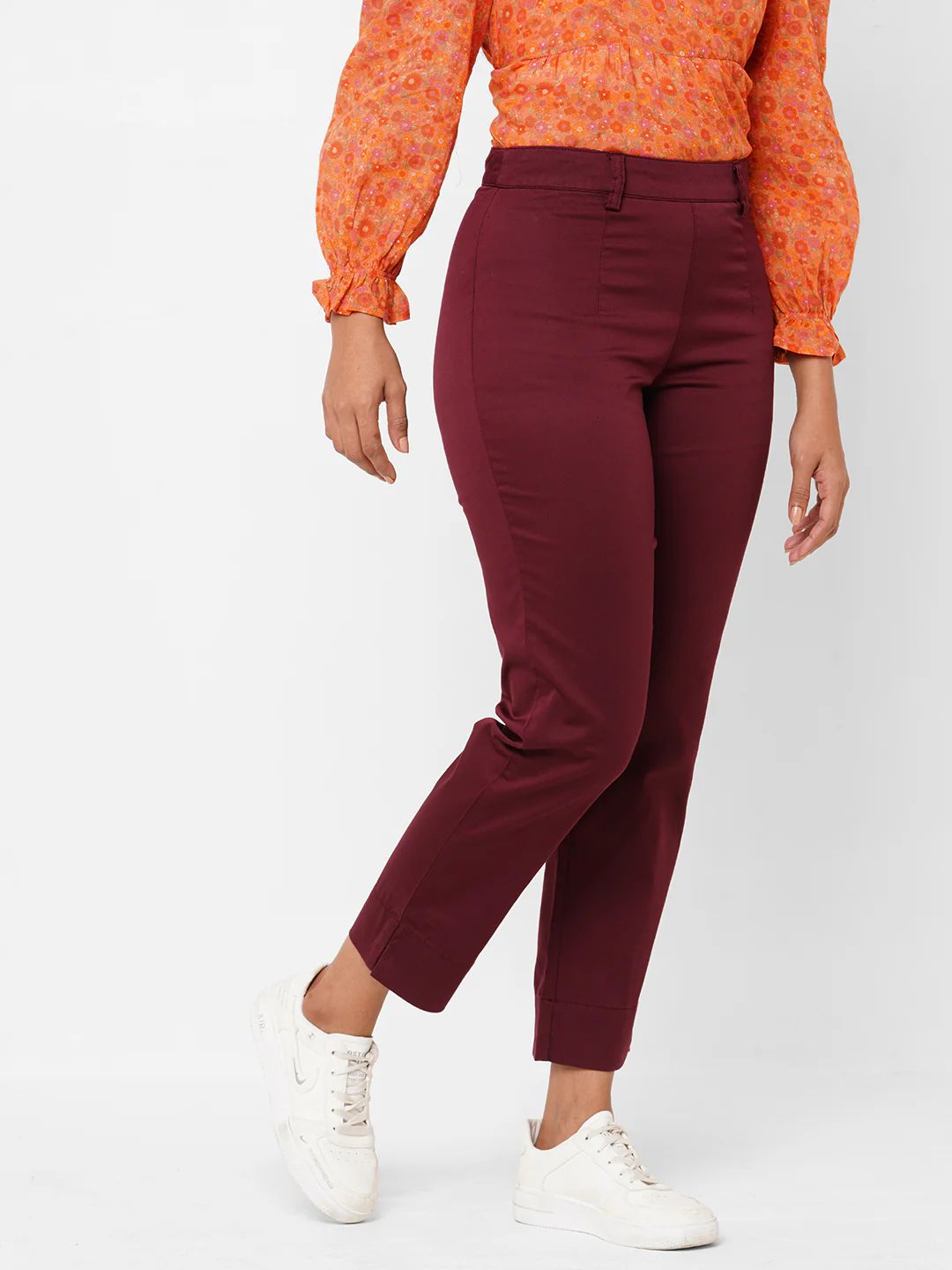 Get ready to fall in love with the long-lasting comfort of these cotton lycra regular-fit pants. A fitted waist, ankle length, mock pockets, and side slits make it the perfect pair for any occasion. These straight-leg pants feature slip-on wearability with a quintessential combination of cotton and lycra. Crafted in a deep maroon-red hue with a stylishly comfortable fit, these bottoms are a go-to. Throw on your favourite top for a dream-like look.