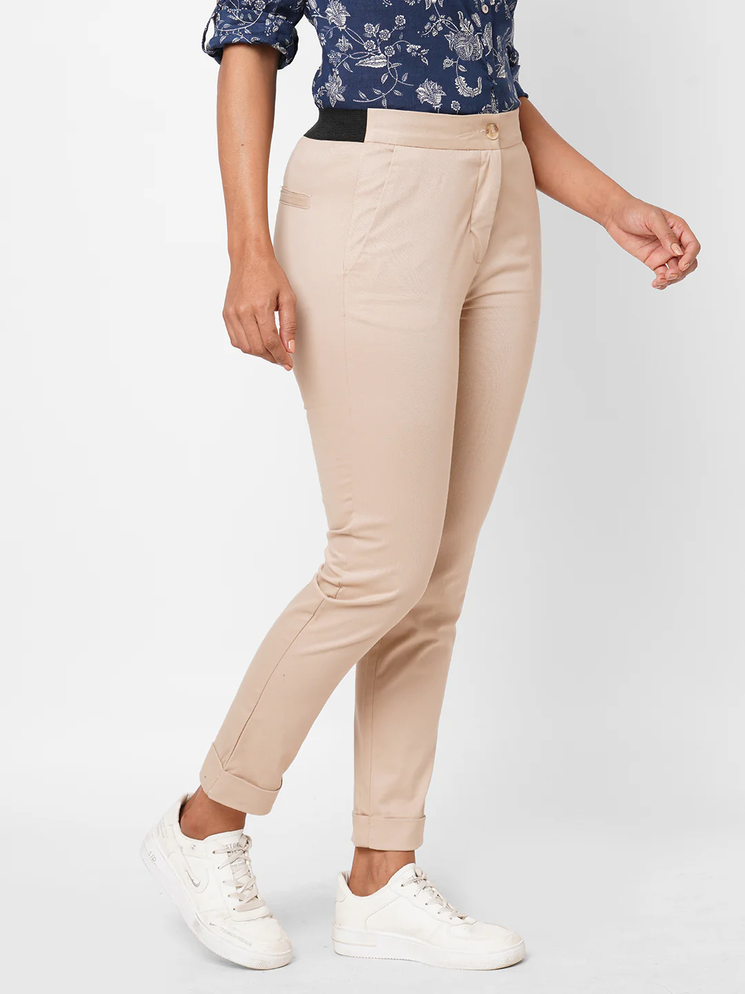 Women's Beige Cotton Lycra Slim Fit Pant